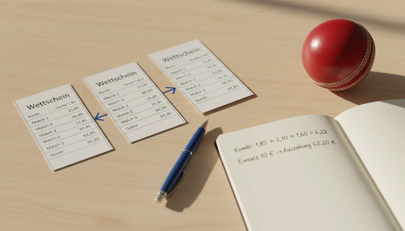 Eine bewährte Cricket-Kombi-Strategie: Kombiniere zwei Favoriten-Siege aus verschiedenen Spielen am selben Tag. Wenn Mumbai in der IPL bei 1.55 und Australien in einem T20-International bei 1.40 steht, ergibt die Zweier-Kombi eine Quote von 2.17. Die Gesamtwahrscheinlichkeit liegt bei rund 46 Prozent — weniger als bei einer Einzelwette, aber deutlich höher als bei einer Dreier- oder Vierer-Kombi. Dieses Modell funktioniert als gelegentliche Ergänzung zu deinen Einzelwetten, nicht als Hauptstrategie.